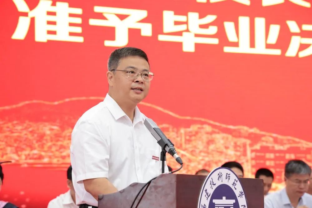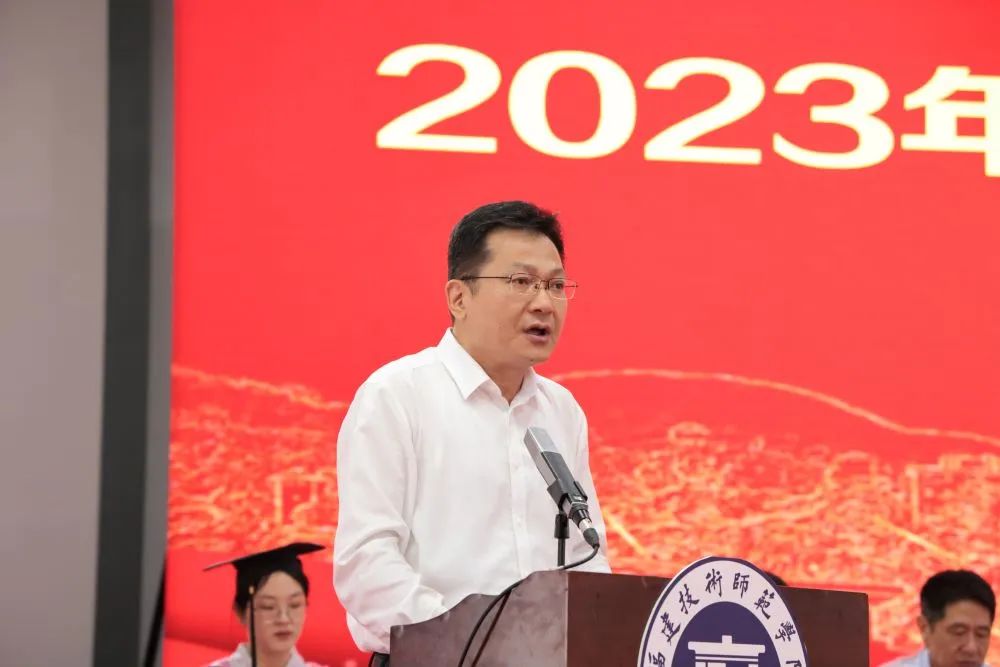 校长廖深基教授作了热情洋溢的讲话。他代表学校向全体毕业生表示热烈的祝贺,向老师和家长表示衷心的感谢。他指出,2023届毕业生注定是不平凡的。同学们与全国人民守望相助、共担风雨,度过了终身难忘的校园时光,迈出了向阳而生的坚定脚步。他向大家提出四点希望。一要永葆追梦的勇气,做一个有理想的人。要与时代共鸣、与国家共进,敢于有梦、勇于追梦、善于圆梦,当好“国系青年”,以脚踏实地、干好本职的“小我”,融入到实现国家富强、民族复兴、人民幸福的“大我”之中, 把爱国情、强国志、报国行体现在最质朴的实践上,为实现中国梦添砖加瓦,让青春与“星辰大海”撞个满怀。二要勇攀事业的高峰,做一个有本领的人。要珍惜人生出彩的机会和施展才能的舞台,立足岗位、增长本领,不懈奋斗、勇攀高峰,用长久的努力和耐心的付出,去成就人生的高度、拓展人生的宽度、提升人生的广度。三要直面人生的风雨,做一个有担当的人。要保持青春的勇气和担当的本色,传承“艰苦创业、拼搏争先”的学校精神,正确面对人生的成功和困顿,在新的赶考路上、在服务人民的实践中建功立业,勇做一往无前、劈波斩浪、百折不挠的“孤勇者”,勇做新时代的“闯关人”“弄潮儿”,用奋斗走出自己的康庄大道。四要涵养自身的修为,做一个有品行的人。要加强品德锤炼和道德修养,树立规则意识,坚持独立思考,以宽容之心待人、以真诚之心处友、以豁达之心处世,矢志追求更有高度、更有境界、更有品位的人生,用勤劳的双手和诚实的劳动创造属于自己的美好生活。