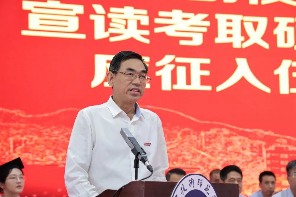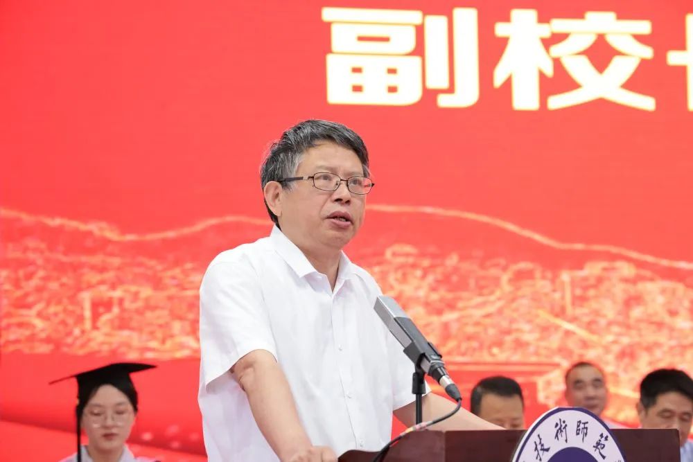 福建师范大学副校长陈庆华教授代表福建师范大学向顺利完成学业的原福清分校毕业生致以热烈祝贺和美好祝愿。他指出,同学们兼具福建师范大学和福建技术师范学院的双重校友身份,见证了一衣带水、永续不断的两校情缘。福建师范大学始终关心关注着大家的成长,也将目送着大家走向更高更广阔的舞台。他向毕业生提出了三点希望。一要立大志,仰望星空逐梦;二要下苦功,脚踏实地拼搏;三要善创新,永立潮头争先。他同时还以“和道德孝忠勇节义,荣耻悔悯福安亏曲,守正创新无愧时代,内慧外秀安康幸福”相赠毕业生,为大家送出美好祝福。